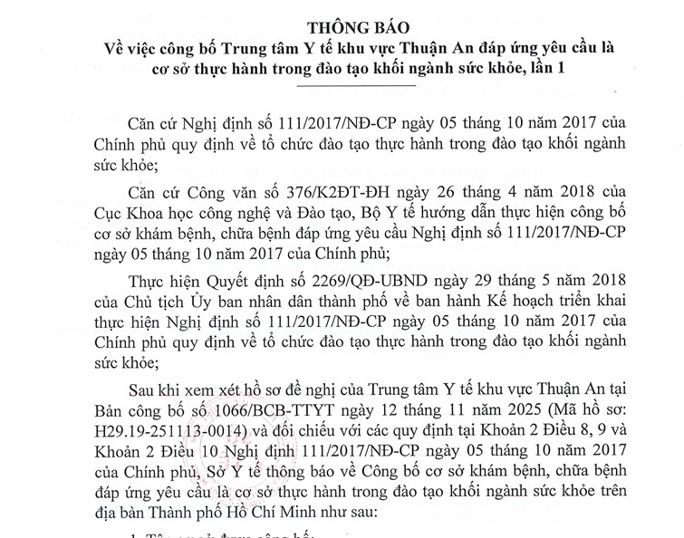 Trung tâm Y tế Khu vực Thuận An đáp ứng yêu cầu là cơ sở thực hành trong đào tạo khối ngành sức khỏe, lần 1